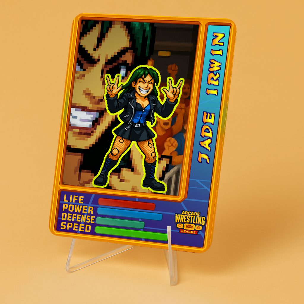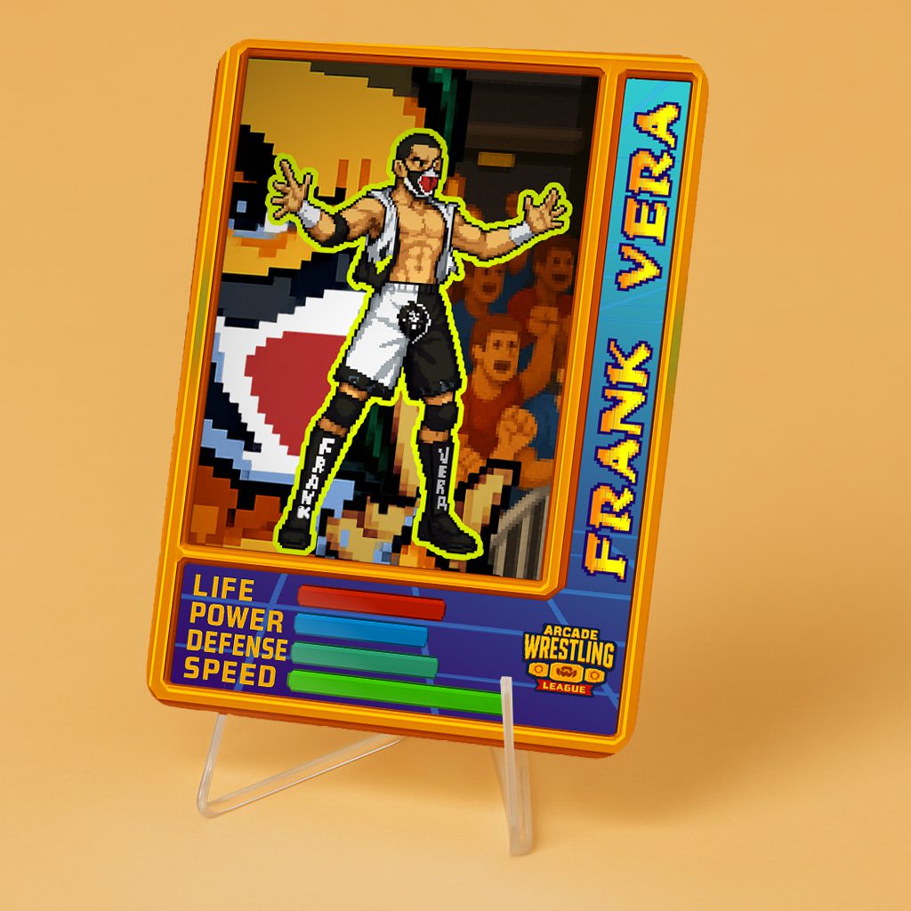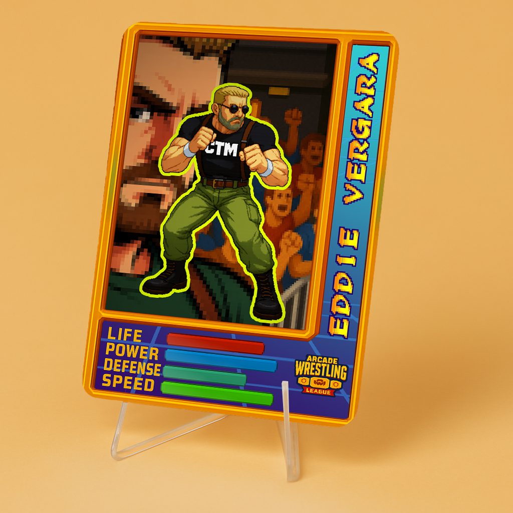Revive la nostalgia de los juegos de pelea arcade con nuestra Carta Foil Coleccionable Personalizada – Arcade Wrestling League. Una pieza única para fanáticos y coleccionistas que combina el brillo del acabado foil con la posibilidad de personalizar tu propio luchador y estadísticas.