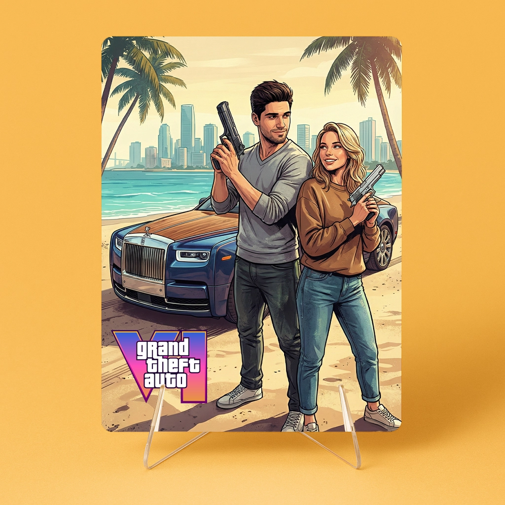 Transforma tu foto en una portada de videojuego legendaria. El estilo visual único de Grand Theft Auto, ahora en una carta de colección brillante.