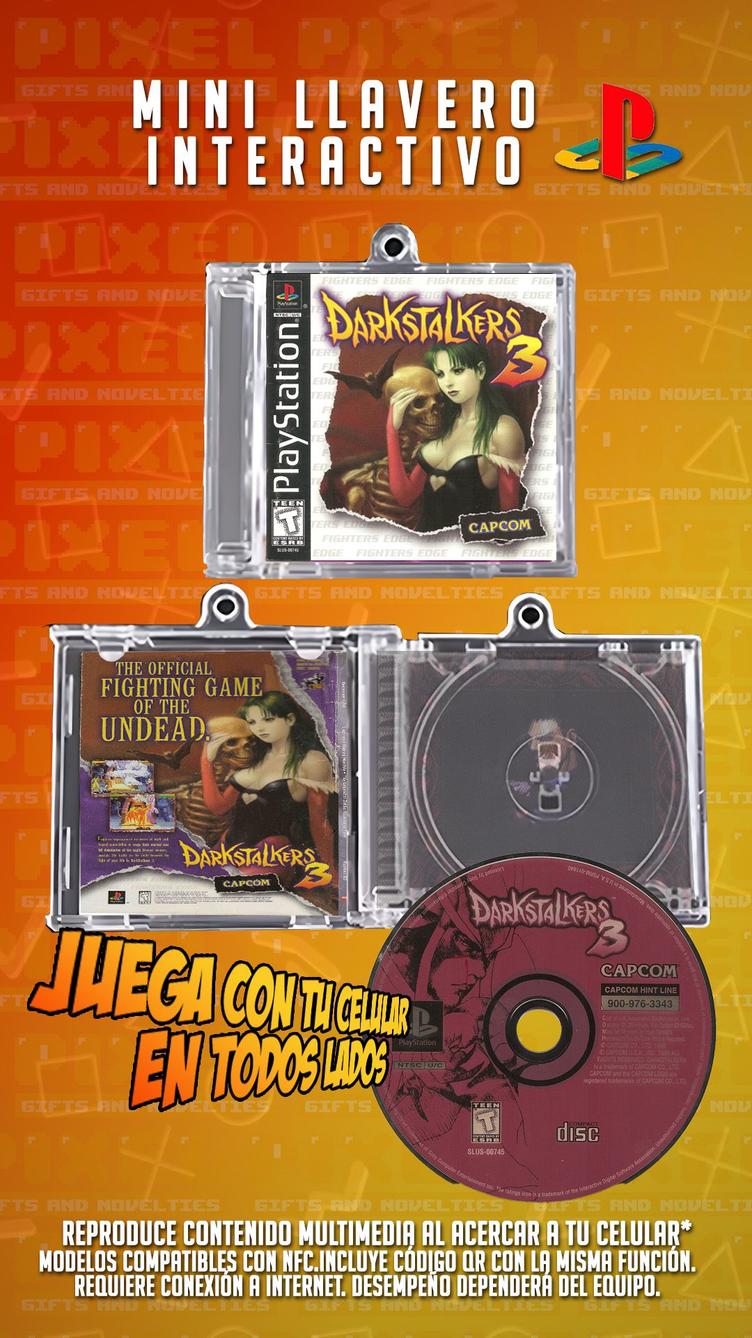 Este mini CD interactivo en forma de llavero te permite jugar Darkstalkers 3, el clásico de PlayStation 1, directamente desde tu celular. ¡Solo acércalo y disfruta!