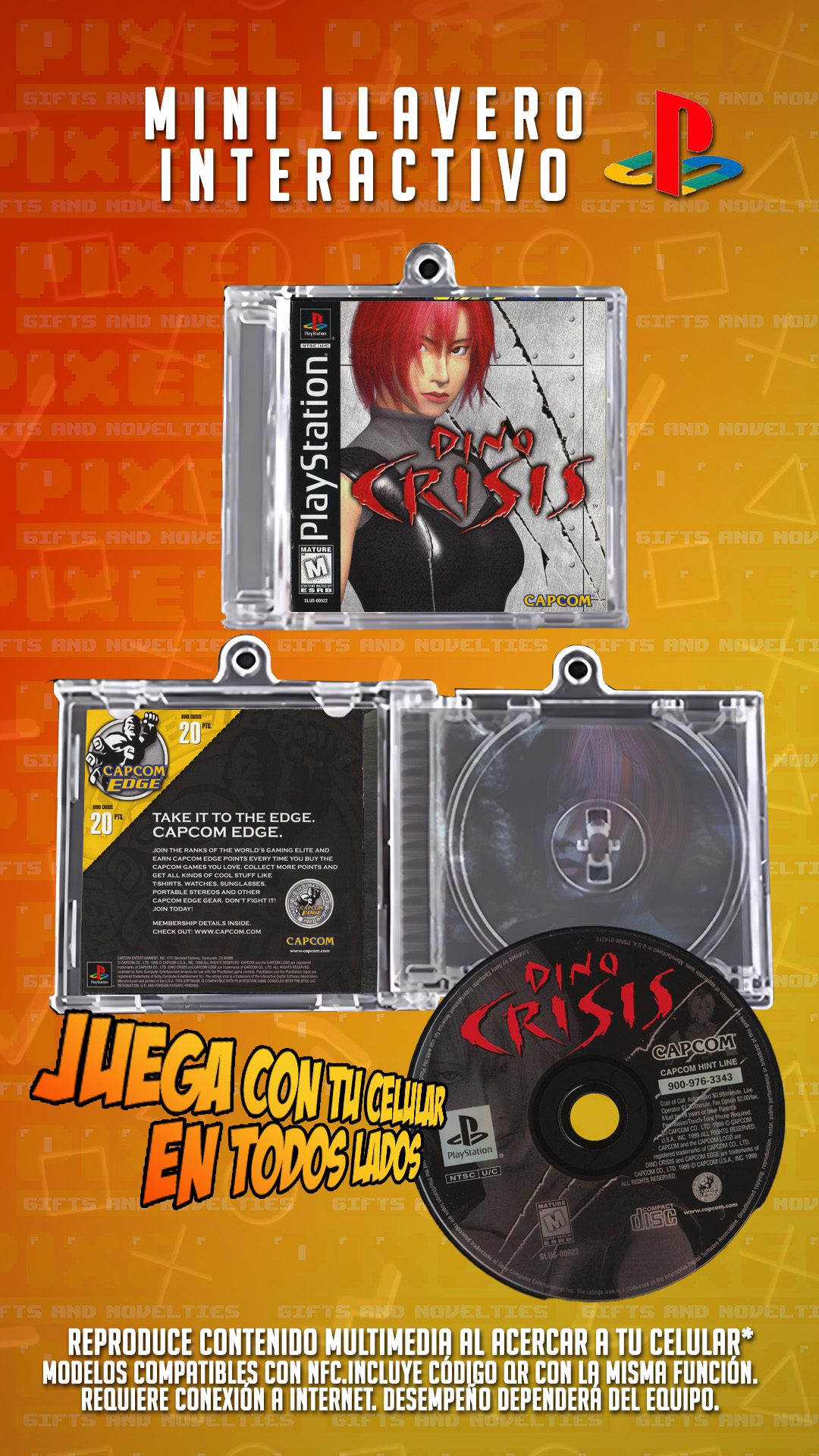 Este mini CD interactivo en forma de llavero te permite jugar Dino Crisis, el clásico de PlayStation 1, directamente desde tu celular. ¡Solo acércalo y disfruta!