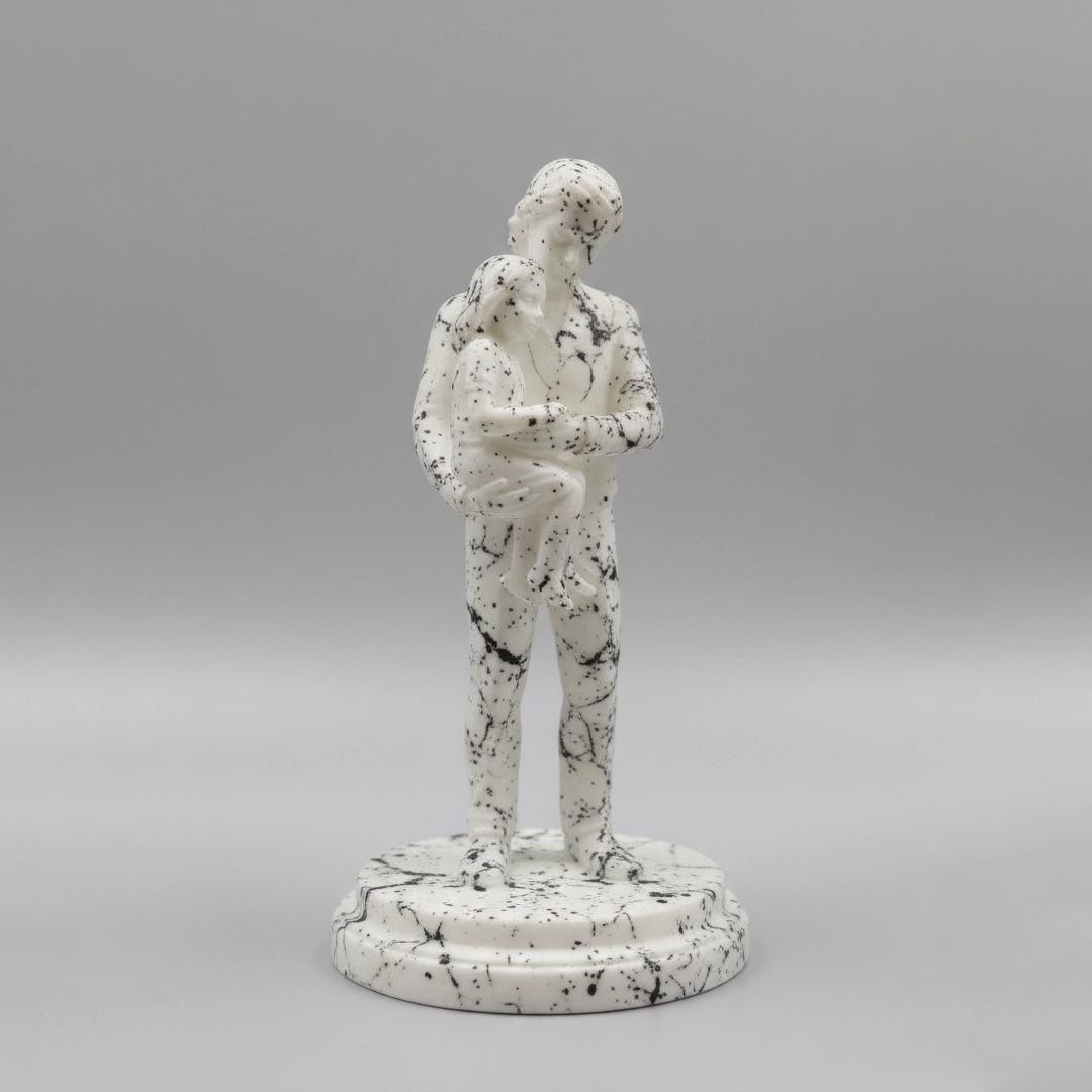 • Acabado Premium Estilo Mármol: Aplicamos manualmente un tratamiento que simula la textura y la elegancia de las estatuas clásicas de mármol blanco, dándole un aire de museo a tu recuerdo.