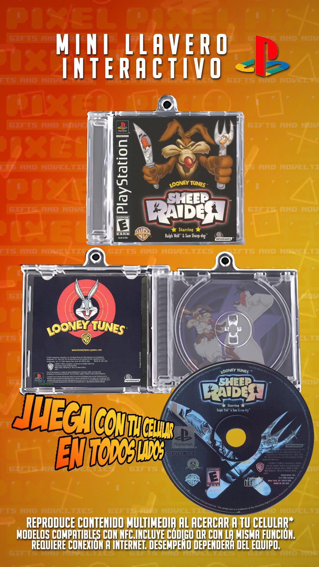 Este mini CD interactivo en forma de llavero te permite jugar Looney Tunes Sheep Rider , el clásico de PlayStation 1, directamente desde tu celular. ¡Solo acércalo y disfruta!