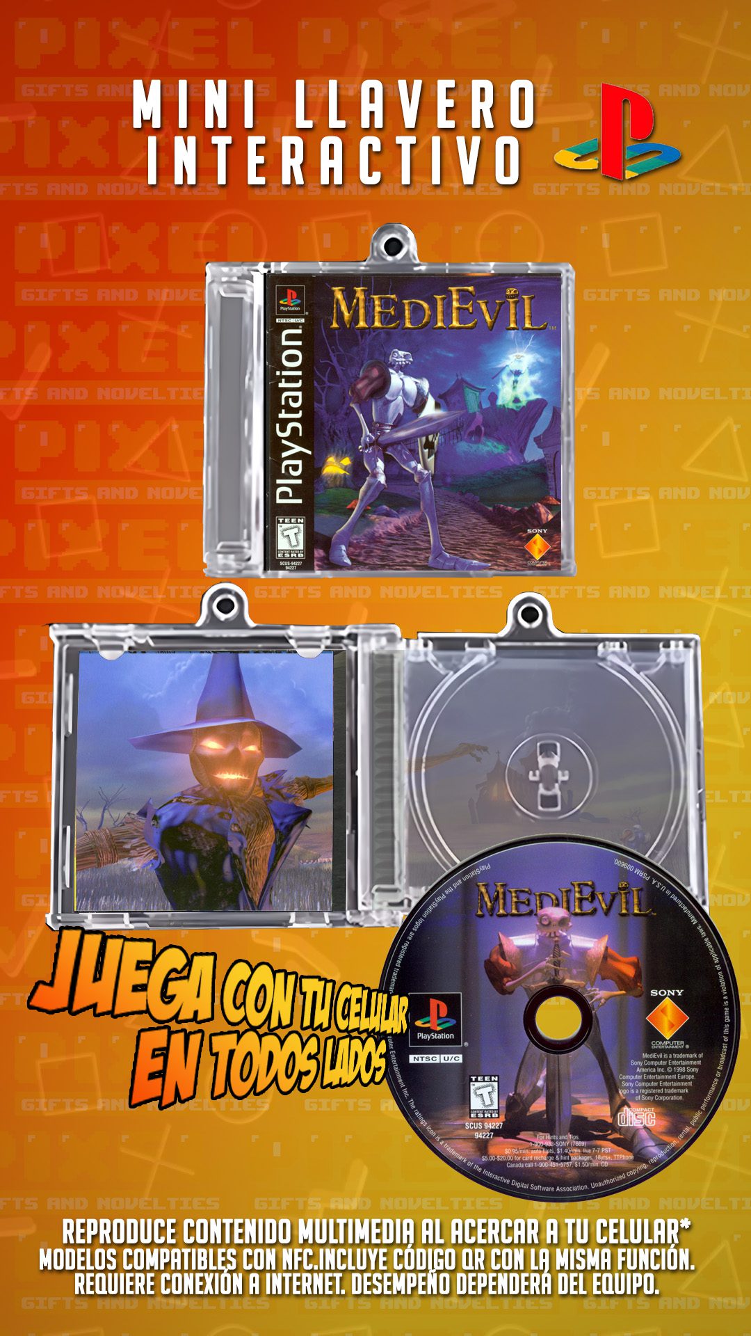 Este mini CD interactivo en forma de llavero te permite jugar Medievil , el clásico de PlayStation 1, directamente desde tu celular. ¡Solo acércalo y disfruta!