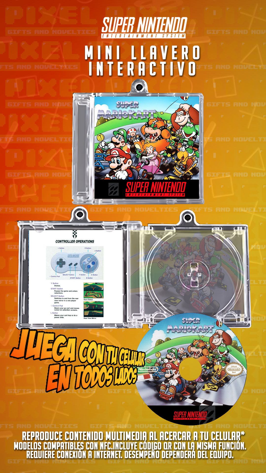 Este mini CD interactivo en forma de llavero te permite jugar Super Mario Kart, el clásico de Super Nintendo, directamente desde tu celular. ¡Solo acércalo y disfruta!