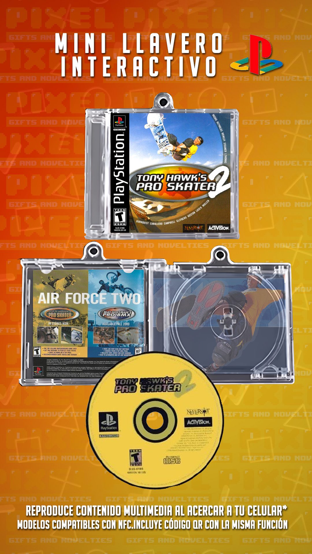Este mini CD interactivo en forma de llavero te permite jugar Tony Hawk Pro Skater 2, el clásico de PlayStation 1, directamente desde tu celular. ¡Solo acércalo y disfruta!