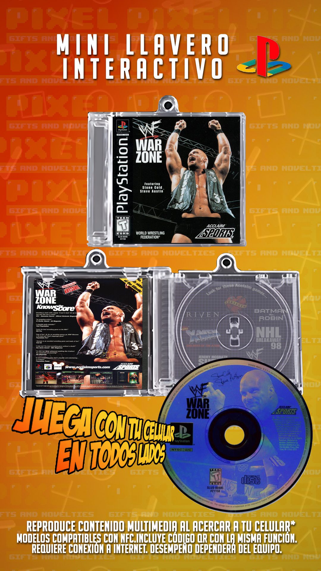 Este mini CD interactivo en forma de llavero te permite jugar WWF War Zone, el clásico de PlayStation 1, directamente desde tu celular. ¡Solo acércalo y disfruta!